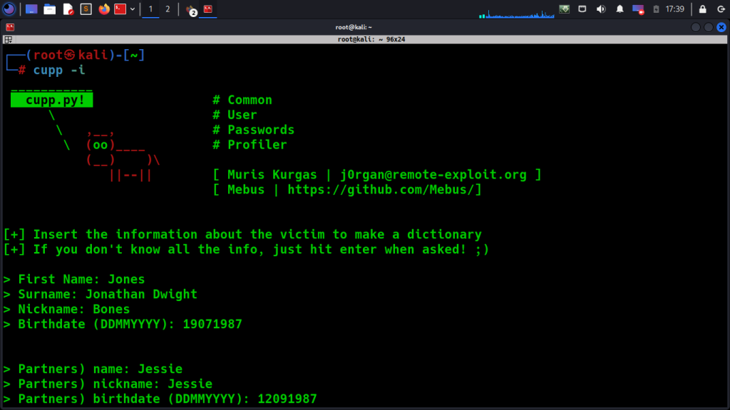 For instance, you can create a wordlist using Cupp based on the target’s first name, last name, and birthdate: