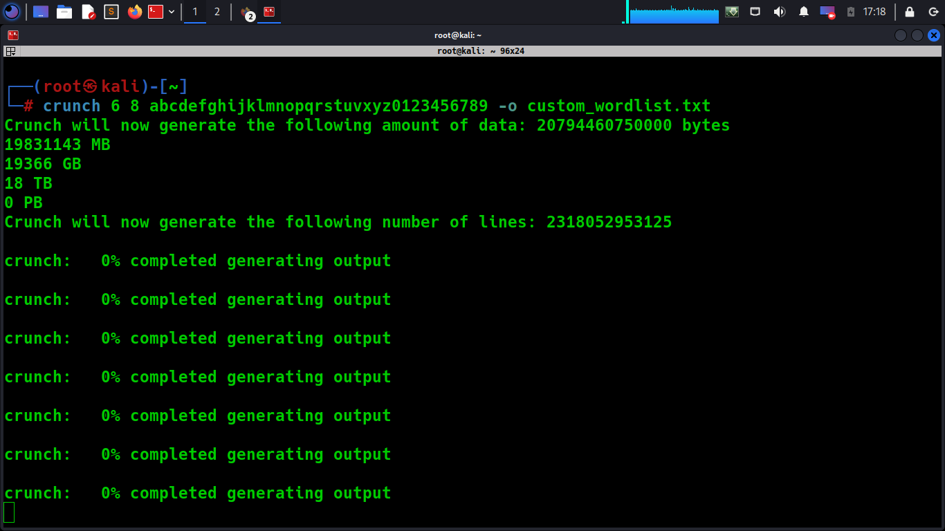 crunch 6 8 abcdefghijklmnopqrstuvwxyz0123456789 -o custom_wordlist.txt