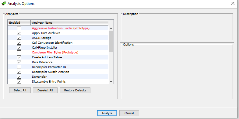 If the file is not analyzed, a list of Analyzers will appear in order for the user to enable various analyzers depending on the format of the file.