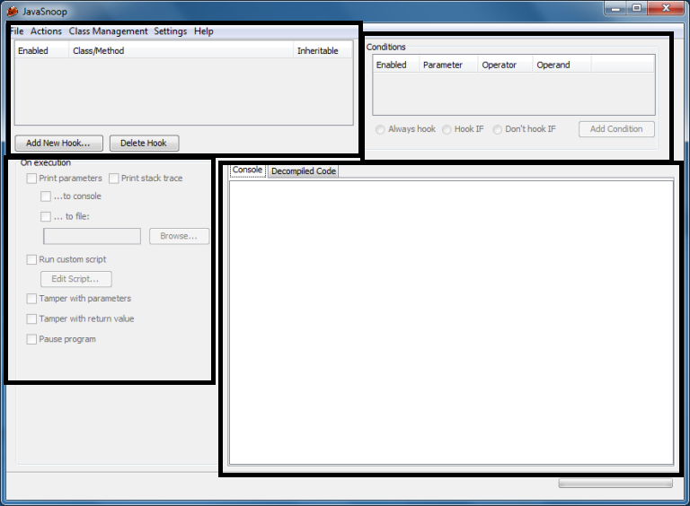 Here in this area, it shows the output from the hooks and the decompiled classes from the target application.