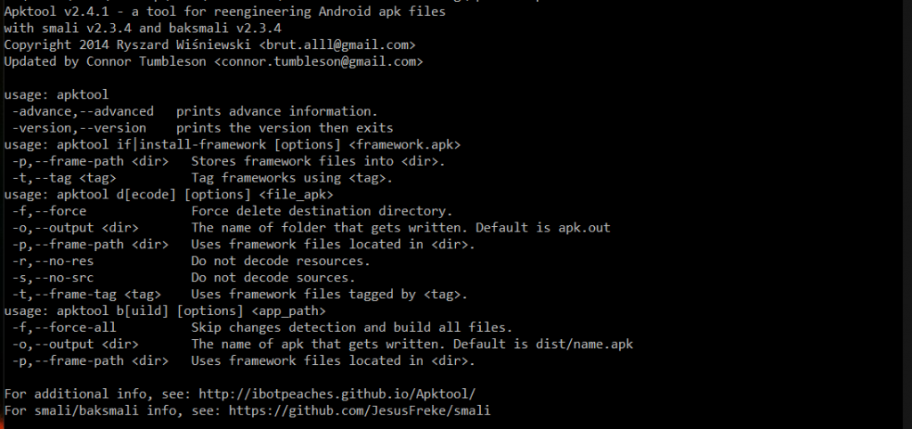 Upon decoding the files, after making changes or inspecting the APK, a user can build the decoded files using the build function (b) by selecting the file with the decoded files of the APK and an output name of APK (-o).