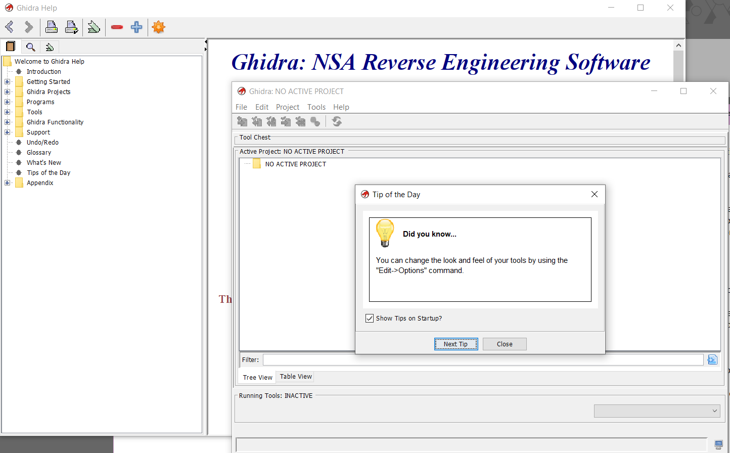 Upon opening the program Ghidra provides TIP of the day that can be useful for new users or even experienced users, providing with something of new information about the usage of the program.