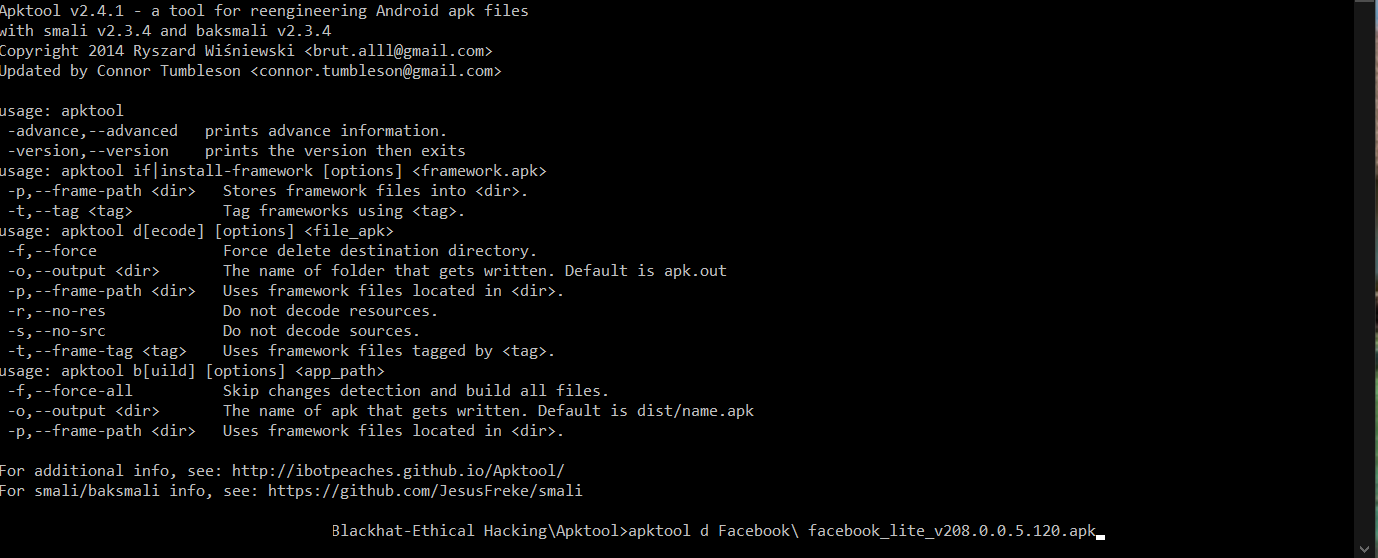 Upon decoding the files, after making changes or inspecting the APK, a user can build the decoded files using the build function (b) by selecting the file with the decoded files of the APK and an output name of APK (-o).