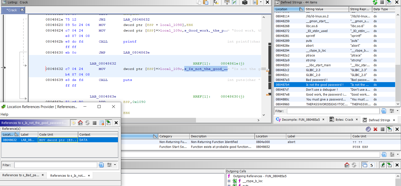 To identify references to a string, the user should right-click in the blue area in the listing window – References – Show References to Address: