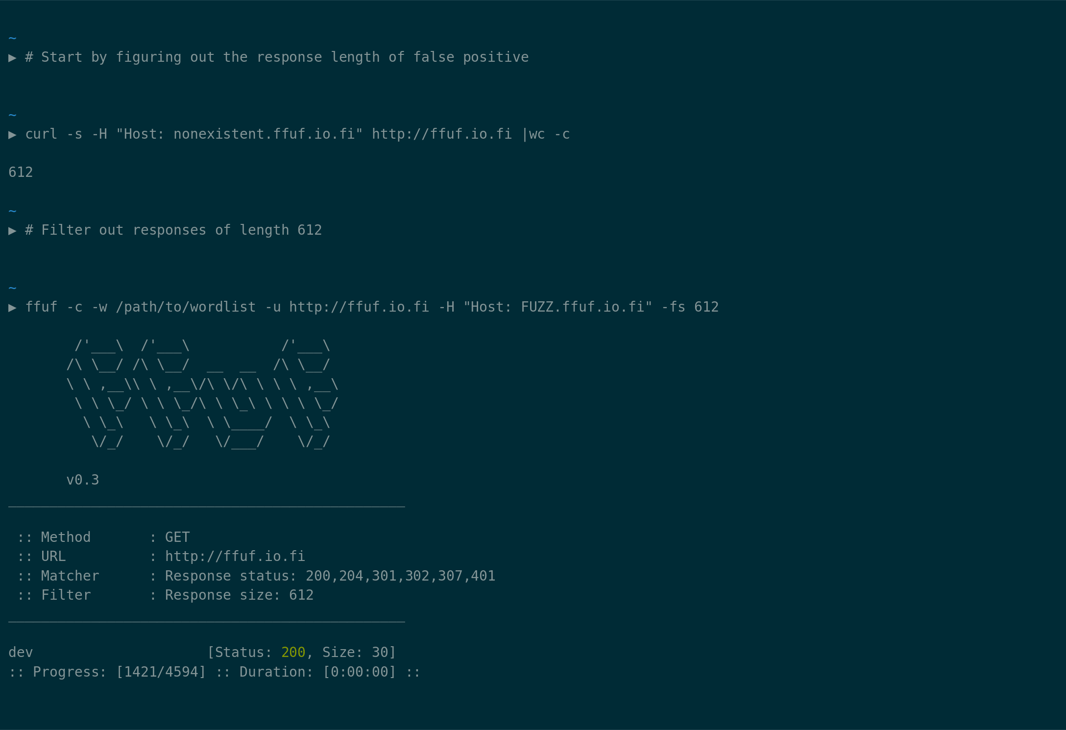 Assuming that the default virtualhost response size is 4242 bytes, we can filter out all the responses of that size (-fs 4242) while fuzzing the Host – header: