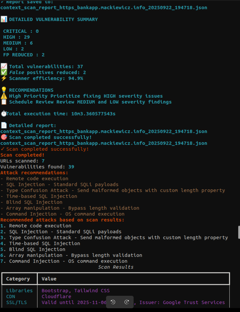 Output file is named scan_report_[targetURL]_[dateTime].json. Scanner recognizes ~20 patterns in Java web files and also checks for OWASP Top 10 vulnerabilities. Scanner output gives recommendations and points to forms that might be vulnerable (false-positive reduction applied):