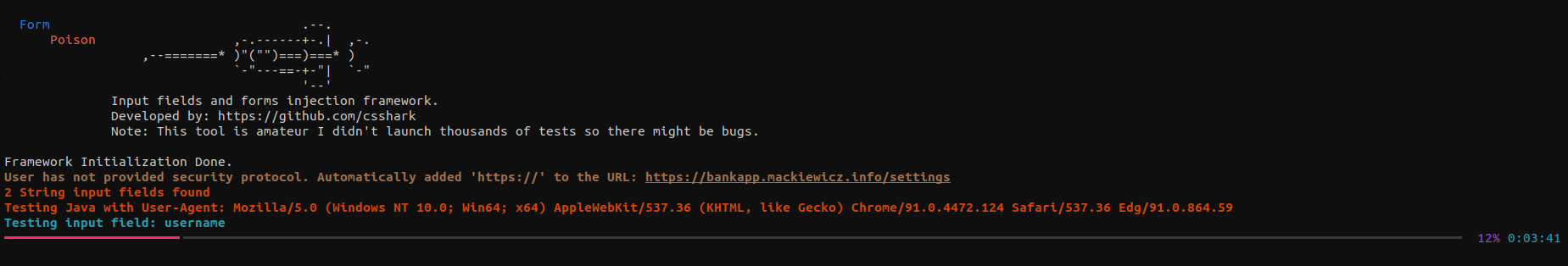 Scan mode has been extended into JavaScript code scanning and looking for common vectors of code / inproper value injection to bypass some filters. The scanner is separate project integrated into FormPoison by default. It is recommended to run scan to identify attack vectors by yourself first. Scanner works for 10 minutes max. for smaller apps, to keep lightweight form – this is not autonomus DAST replacement. By default scanner runs with 100 3 10 (100 MaxURLs, 3 MaxDepth, 10 Workers) to suit all the environments. However user is allowed to change those values via FormPoison flags.