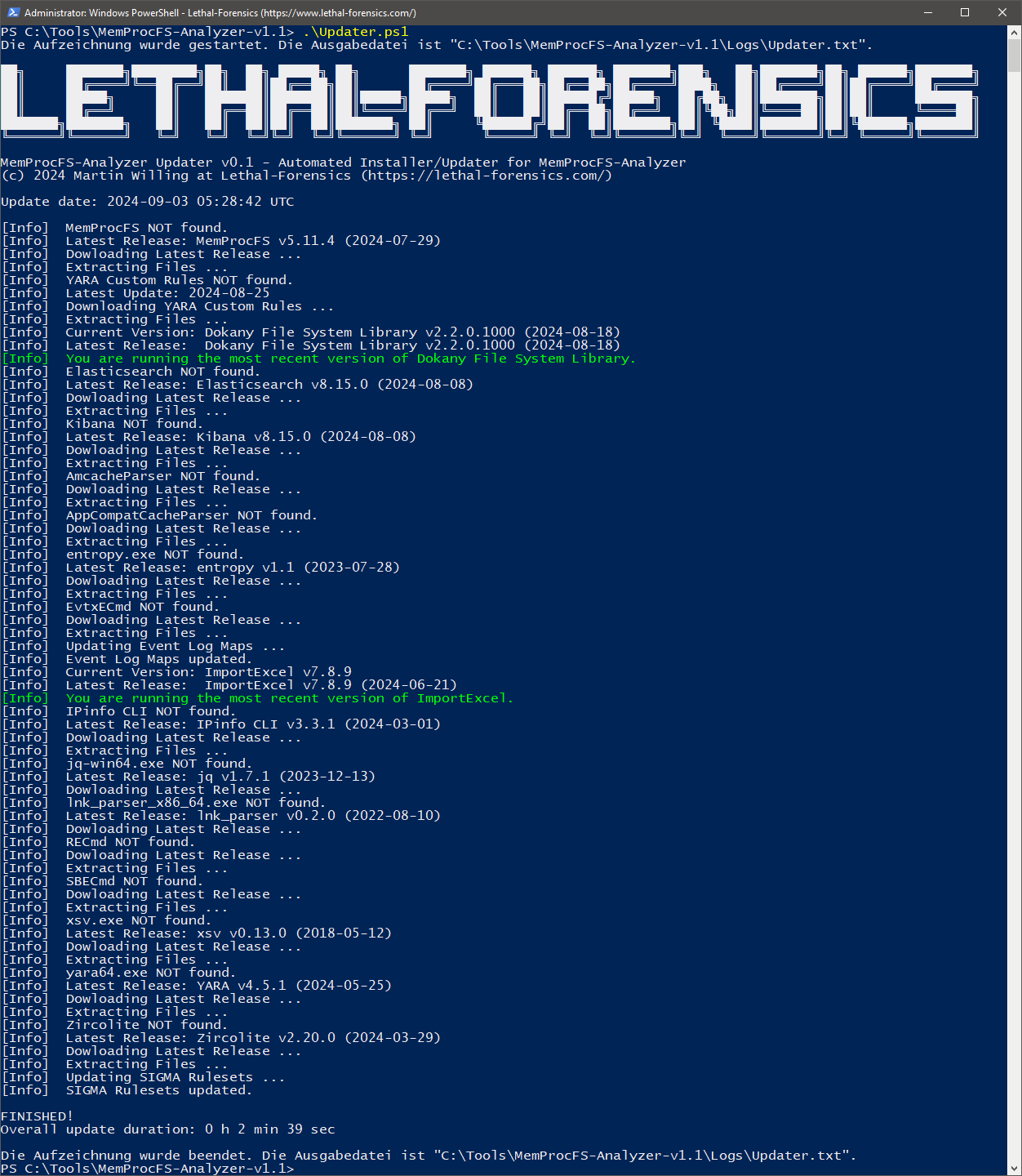 - Auto-Update of MemProcFS, AmcacheParser, AppCompatCacheParser, Elasticsearch, entropy, EvtxECmd (incl. Maps), ImportExcel, IPinfo CLI, jq, Kibana, lnk_parser, RECmd, SBECmd, xsv, YARA, and Zircolite