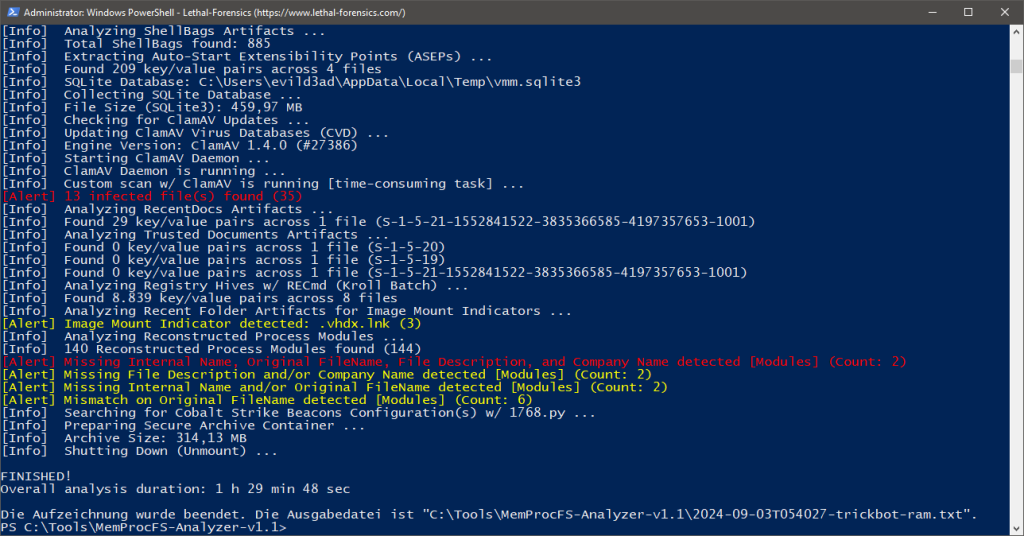 - Collecting Evidence Files (Secure Archive Container → PW: MemProcFS)