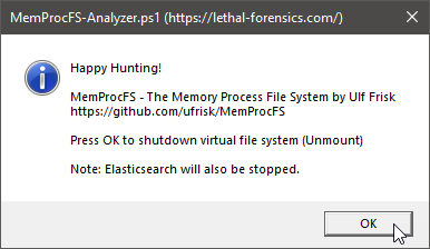 Fig 24: Press OK to shutdown MemProcFS and Elastisearch/Kibana