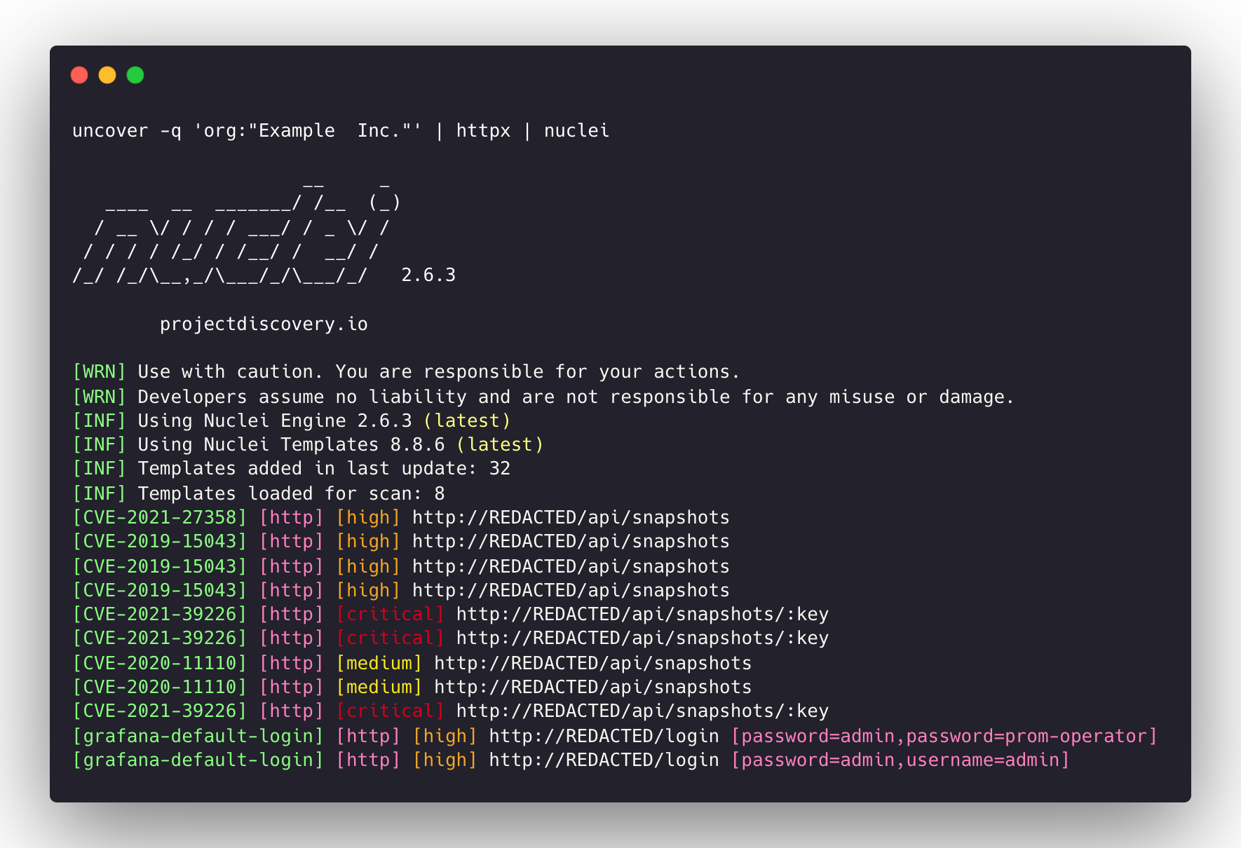 - uncover -q ‘org:”Example Inc.”‘ | httpx | nuclei – Runs httpx / nuclei for vulnerability assessment.