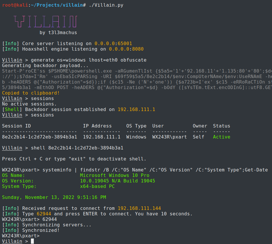 Villain by t3l3machus is a Windows & Linux backdoor generator and multi-session handler that allows users to connect with sibling servers (other machines running Villain) and share their backdoor sessions, handy for working as a team. It has also a built-in auto-obfuscate payload function to assist users in bypassing AV solutions.
